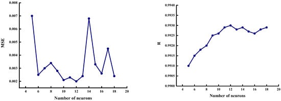 In this study, we selected five neurons in the input layer and one in the output layer. Increasing the number of hidden layer neurons can improve the mapping ability of BP neural networks, but when the number of neurons exceeds a certain value, the network performance deteriorates [30]. Therefore, the mean square error (MSE) and correlation coefficient® are generally used to determine the number of hidden layer neurons. Figure 7 shows the MSE and R values for different numbers of neurons.