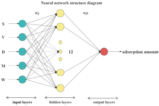 Figure 7 shows that when the number of neurons was 12, the BP neural network performance was the best in terms of overall trend: the MSE was the lowest, the R value was the highest, the network convergence speed was faster, and the network was more stable. Therefore, we determined that the appropriate structure of the BP neural network was 5-12-1. We constructed a network structure, as shown in Figure 8, and used five factors (S, V, D, mineral content [M], and moisture content [W]) as the inputs of the BP neural network. Additionally, we used the saturated adsorption capacity of CO2 (Q) as the output of the network.