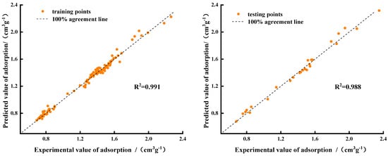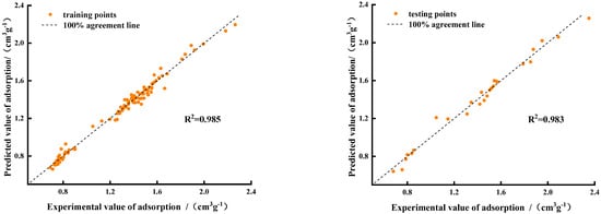 Figure 9 shows a joint scatter plot of the predicted CO2-saturated adsorption amount calculated using the BP neural network model and the experimental value. In the figure, the x-axis represents the actual adsorption amount measured in the experiment, and the y-axis represents the adsorption amount predicted by the neural network. The black dotted line represents the 100% regression line. The closer the scatter is to the black dotted line, the more accurate the prediction of the neural network algorithm. Figure 8 shows that the data points of the training and test sets are distributed near the regression line, indicating that the trained model had high prediction accuracy.