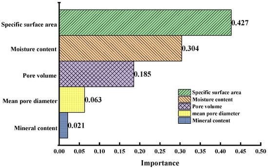 Figure 10 shows the overall influence of the five input characteristics on the target variable. The specific surface area was the most influential factor among the five factors, and water content was more influential than pore volume. Moreover, the sum of the importance weights of the specific surface area, moisture content, and hole volume was 91.6%, which was much higher than those of the other two factors. However, the mean pore diameter and mineral content had little effect on the adsorption capacity.