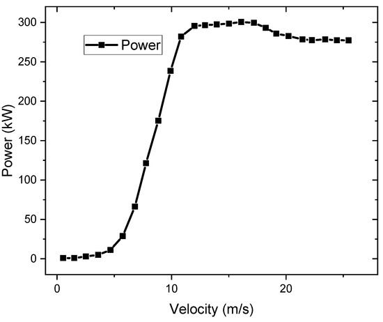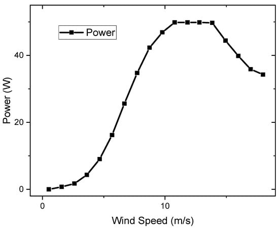 By integrating the components of the system, which are the wind turbine, electrolyzer, and fuel cell, the hybrid system was created, based on the power curve given by Ref. [37] for the wind turbines. The wind turbine has a blade diameter of 2 m and a tower height of 2.5 m. Figure 3 shows the utilized wind turbine power curve (Sabaniro brand). Table 2 also determines the rotational speeds of the turbines with different dimensions. According to Table 2, the minimum required rotational speed was 23.57 radians per second or 225 rpm, which is related to a 3-blade turbine with a blade diameter of 0.6 m and a mass of 0.5 kg.