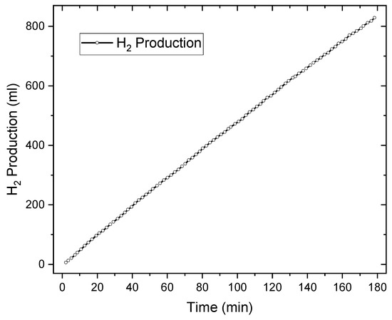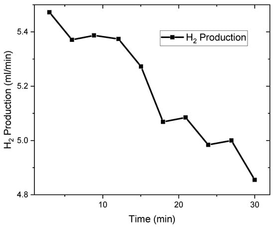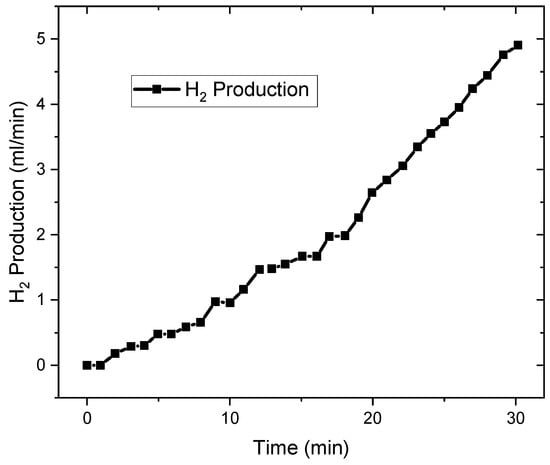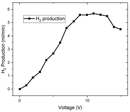 In Figure 5, hydrogen production decreases over time as a result of the reduction in the sulfuric acid due to the corrosion of the anode. Figure 5 also shows that hydrogen production decreases after a specific voltage of 12 volts. Furthermore, Figure 6 and Figure 7 show the changes in hydrogen production in terms of changes in the input power to the AEL and the volume flow of hydrogen, respectively.