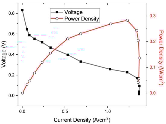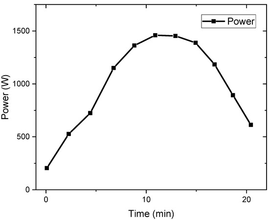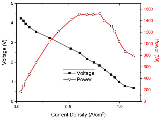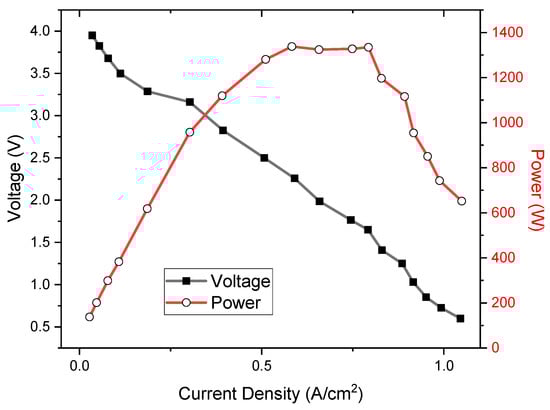 As the potential difference between the two ends of the electrodes increases, the amount of hydrogen production increases to a point where the hydrogen output is almost constant and then decreases. The reason for the constant state and then the decrease in hydrogen production can be considered as the increase in resistance due to the fusion between the electrodes. In this regard, a part of the applied voltage must be used to overcome this resistance. The corresponding graph of voltage and current density in terms of power is shown in Figure 11. Figure 12 also shows the amount of hydrogen produced in three hours, which indicates the enhancement in the hydrogen production to about 800 mL.