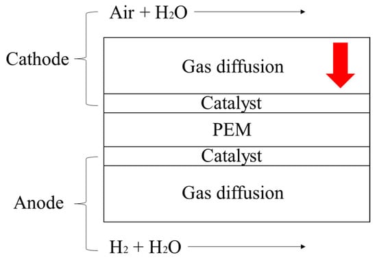 The simplified models in this section are based on an MEA, which includes the following three domains: a cathode, a separator, and an anode, as shown in Figure 1. The separator comprises of two gas diffusion layers, two catalyst layers and one PEM [18]. The red arrow along the MEA indicates the inlet to outlet direction of the cathode gas. Gas diffusion is presented between the catalyst and current collector on the cathode and anode sides. Oxygen reduction reactions and hydrogen oxidation reactions occur inside two different areas of the catalyst, respectively [19].