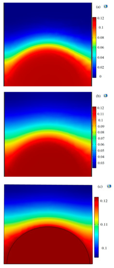 Top view of the oxygen concentration at (a) 0.5 V, (b) 0.7 V, and (c) 0.9 V.