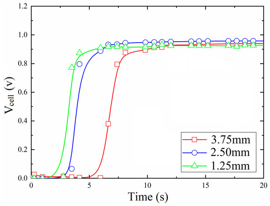 The proposed actual-oxygen-supply-coefficient is employed to relax the gas diffusion, as not all the oxygen supplied to a single cell can be absorbed during actual operation. In Figure 6, the relevant voltage simulation data are shown. The data of MEAs with total thicknesses of 1.25 mm, 2.50 mm, and 3.75 mm are reported in the same figure in order to highlight how oxygen diffusion affects the performance of PEMFCs. By applying Equation (10), we can obtain values of the permeation capacity and the penetration time at different total thicknesses, which are listed in Table 2.