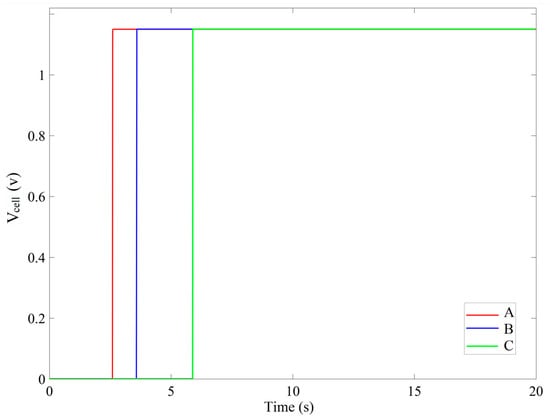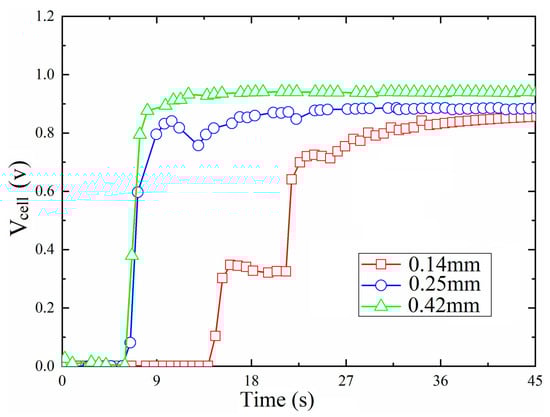 As shown in Figure 3, the voltage data of the three group MEAs with different total thicknesses of the diffusion layer is compared. In the first stage, , the oxygen gradually permeates through this diffusion layer and has not yet reached the catalyst layer, so that the voltage at this time remains zero. The duration of this stage reflects the rate of oxygen penetration through the gas diffusion layer, as well as the actual-oxygen-supply-coefficient for the specific electrode material. In the second stage , the oxygen has reached the catalyst layer, and a small molar concentration for the reaction is required by calculating the model. At this moment, it can be assumed that the electrons immediately have saturation after the oxygen reaches the catalyst layer, which is the voltage reaches the steady-state value. In the last stage, , the voltage is maintained at the steady-state value. However, the electrode voltage is directly affected by decreasing the water content of the proton membrane in the reaction procedure, such as the water content of the proton membrane. Therefore, the steady-state voltage is less than the standard electrode potential in the actual operation.