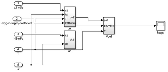 Furthermore, the verification of the suggested models is applied to the dynamic simulations. The feasibility of the open circuit voltage model based on the gas diffusion is investigated. The modeling and simulation of PEMFC operation are developed and performed in a Simulink environment and validated through the above experimental data. Due to the simplifying assumptions, the voltage of the fuel cell can be represented as the open circuit voltage. The model built in Simulink is obtained from the above equations and is shown in Figure 5. For both the cathode and anode of overvoltages, there are two subsystems in which the input parameters are required. Where the input consists of hydrogen and the oxygen flow, the oxygen diffusion factor, the electrode temperature, current and electrode area. The output is the electrode voltage. In the cathode simulation model, the input includes the actual oxygen supply coefficient, the temperature, the oxygen flow rate, and the current, and the output is the oxygen partial pressure.
