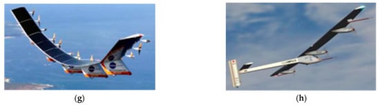 Different solar UAVs and aircraft. (a) Atlantik Solar from Zurich University; (b) Sky Solar from Zurich University; (c) Sun project from Hong Kong University; (d) Stratospheric airship, solar powered; (e) Zephir project from Airbus; (f) ELHASPA project from DLR; (g) Helios project from NASA; (h) Solar Impulse project.