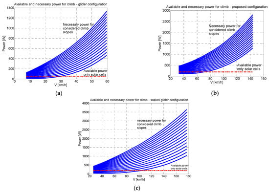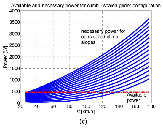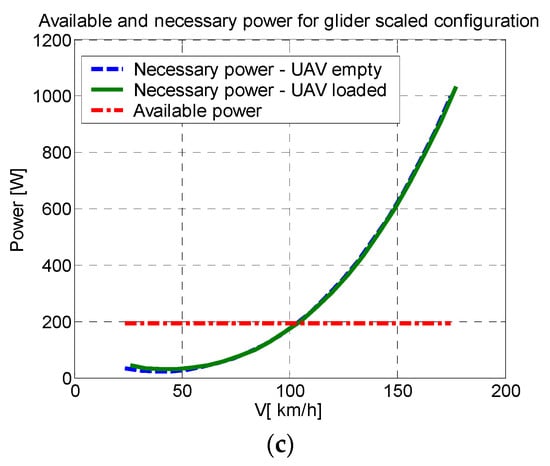 Available and necessary power for horizontal flight: (a) glider configuration; (b) Newsolar configuration; (c) scaled glider configuration.