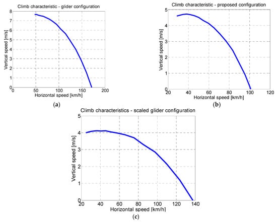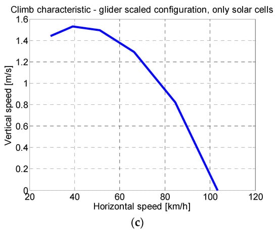 Climbing characteristics at maximum electrical motor power: (a) glider configuration; (b) Newsolar configuration; (c) scaled glider configuration.