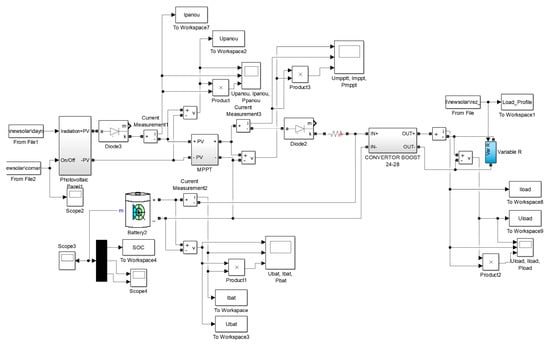 Alongside the power sources mentioned previously, the system contains a MPPT (maximum power point tracker) for the solar cells’ output. This maintains the solar cells at the maximum power point. The MPPT output and the battery are in parallel on the input of a DC/DC boost converter. This raises the output battery voltage from 24 VDC to 28 VDC—the value of the DC bus voltage. Both electric motors and other electrical consumer fed from this voltage are considered. The on-board electrical load is modelled by a variable resistor that follows the load profile. In the scheme, there are other components that permit us to measure voltages and currents at interesting points.
