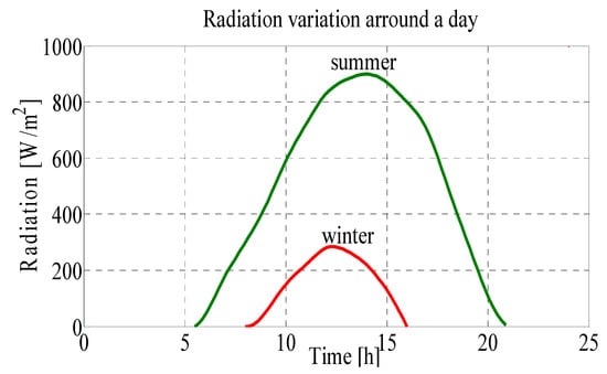 The horizontal flight–maneuver cycle is repeated 30 times throughout a summer day. Solar radiation over the course of a summer day at medium latitudes is shown in Figure 13. The final phase is considered as gliding from 2000 m to 0 m with the on-board systems in function.