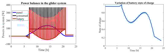 The electric motor is fed at its maximum power using energy from the solar cells and batteries simultaneously. In this case, it is important that the electrical motor operates at maximum power. The glider configuration has one motor with a maximum power of 350 W. The other two configurations have two motors of the same type, so the electric motors’ maximum power is 700 W. Considering electric motor efficiency and propeller efficiency, this provides 233 W propulsion power for the glider configuration and 465 W for the other two configurations.