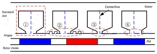 Common structures for reducing cogging torque. ① Standard slot, ② top assisted slots, ③ unequal slot width, ④ offset of slot.