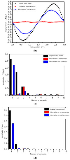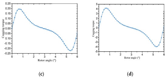 Figure 6c,d show the results of harmonic analysis of the cogging torque waveforms for the two motor models using the skewed slot design. It can be seen that the target harmonics in the cogging torque are significantly weakened by the layered skewed slot, without bringing about a significant increase in the amplitude of harmonics of other orders, and without introducing new harmonic components while reducing the harmonics of the specific order of the cogging torque.