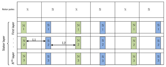 When axial stratification is not considered and the number of stator units in the motor is represented by m, Equation (4) can be expressed as: