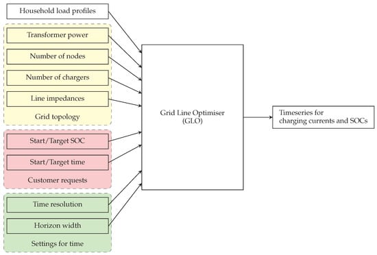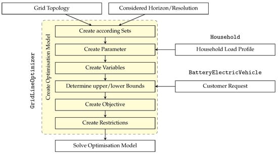 Figure 3, the “considered horizon/resolution” and the information on the number of nodes and chargers from the “grid topology” are used to construct sets for indexing. These sets are used to construct parameters in the optimisation model. The household load profiles are also directly used as parameters in the optimisation model. The “customer requests” are used to determine variable upper and lower bounds in the optimisation model. This information is used to set constraints and boundaries for the optimisation process, ensuring that the solution adheres to the specific requirements and requests of the customers.