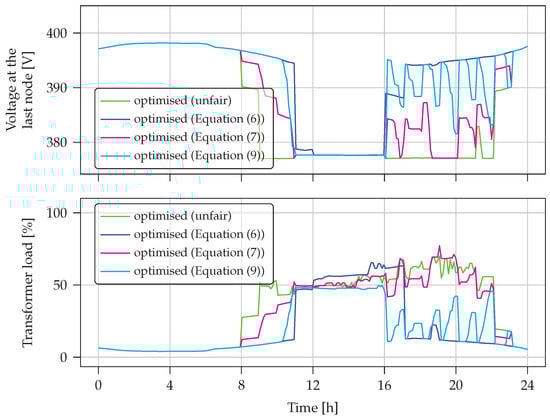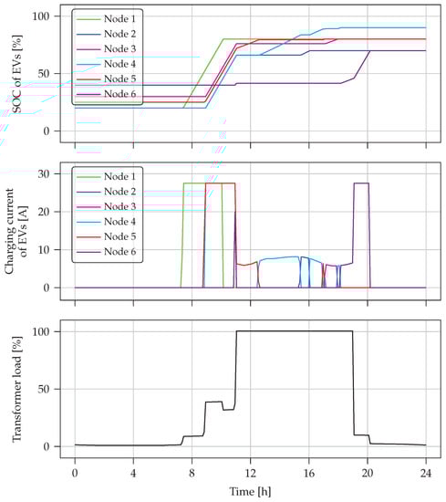17], although a “fair” distribution of charging power was mentioned, there were no constraints to ensure that lines were not overloaded and that node voltages did not drop too far.