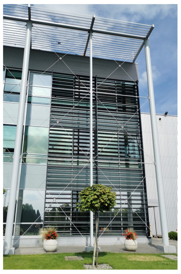 The pilot system with PPV panels is an integral part of the architectural design of the building, using the glazed surface of the façade oriented to the south and considering the required assumptions of interior lighting comfort and energy efficiency of buildings. The overall, real view of the façade with the installation is shown in Figure 1. The dimensions of the installation with PPV panels are: height 10 m, width 3 m.