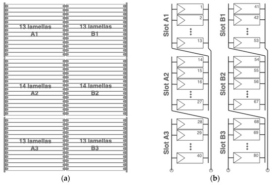The entire façade consists of 80 slats (lamellas) divided into two groups (columns) of 40 slats and connected to a controller in a battery charger with the Maximum Power Point Tracking (MPPT) algorithm implemented. The PPV façade construction framework is shown in Figure 2a. Each group of 40 slats (called sun-breakers as well) is divided into 3 slots connected in series. The second, middle slot consists of 14 slats, while the third and first are 13 panels connected in parallel inside each slot. Figure 2b shows a simplified electrical diagram of the PPV façade installation.