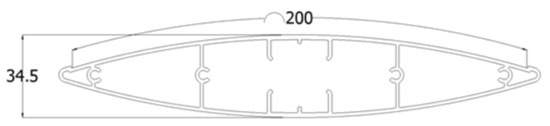 All the slats are made of aluminum and covered with a perovskite film of microscopic thickness; they are 90% lighter than silicon cells. The flexibility of the thin film with PSC modules enables almost entire coverage of the available surface of the slat. The dimensions of a single lamella in mm are shown in Figure 3. The length of each element is 2833 mm.