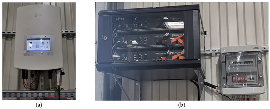 The installation uses a Solis RHI-(3-6) K-48ES-5G inverter with a maximum efficiency of 98.4%. Its nominal power consumption is 7 W. The inverter works with a set of PYLONTECH US2000 rechargeable batteries and LFP lithium batteries (pouch cell type). The 3 battery modules connected in parallel offer a total capacity of 150 Ah. Both inverter and batteries are shown in Figure 5.