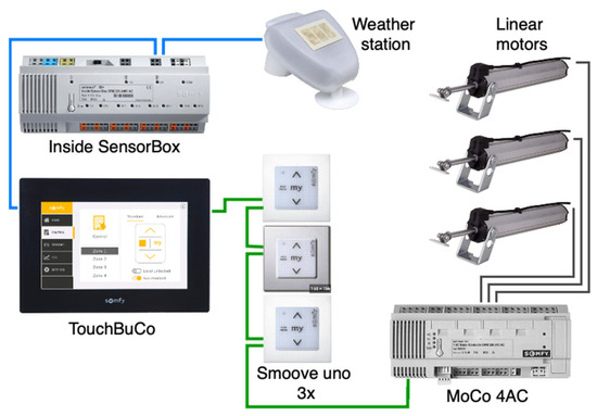 The façade control system is based on the animeo IB+ platform (Somfy BMS platform) and is integrated into the structure of the building management system (BMS) [49,50]. This ensures the possibility of constant monitoring of the system operation status, its configuration, and reading the history of events. It also provides access to weather condition sensors from the weather station integrated within the BMS and located at the roof of the building. Figure 6 shows the connection diagram of all the devices of the dynamic building façade control system.