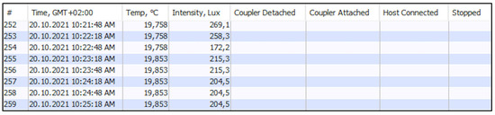 As is standard, data is processed in a dedicated HOBOware software (ver. 3.7.20) used for launching, reading out, and plotting data from HOBO data loggers. The data logs from the logger record: log number, date and time, temperature, intensity in lux, and coupler connection identifiers (if needed). An example of recorded real, raw sensor data is shown in Figure 8.