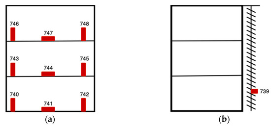 Deployment of data loggers: (a) nine loggers near windows indoor—three for each floor (front view); (b) one data logger outside on the façade construction (left side view).