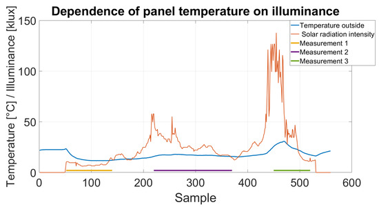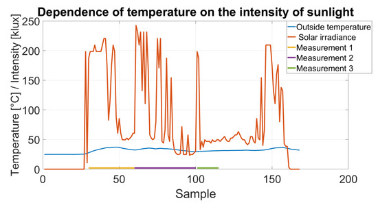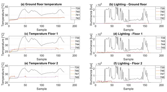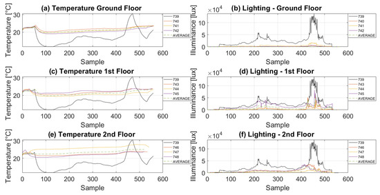 During the first series of measurements, the day was cloudy, and the outside temperature was 25 degrees Celsius. Therefore, the lighting intensity outside was relatively low, on average 50 klux (logger 739). During the measurements, about 600 samples were collected from each sensor, separately, for the temperature and illuminance values. Data was logged every 30 s from about 11:00 am to 4:00 pm. Finally, all data was processed in the MATLAB tool to generate trend graphs. Results are presented in Figure 10.