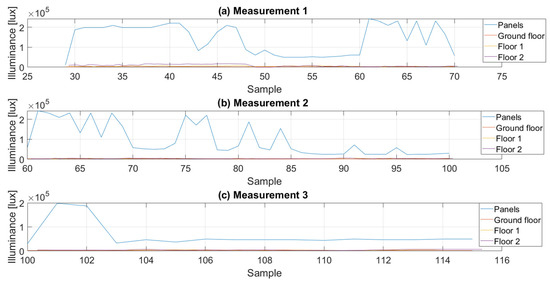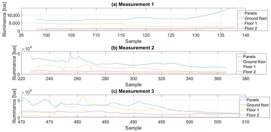In period 1, the angle of the panels was changed from 0 to 60 degrees in an irregular cycle. Period 2 started with the panels position at 0 degrees and increased by equal 10 degrees to a maximum at 90 degrees. In period 3, the angle of tilt was increased every 5 degrees in a regular cycle. It should be noted that the results were also influenced by atmospheric factors; measurements in period 1 were carried out with cloud cover at the level of 90%, in period 2 at the level of 80%, and in period 3 with the most favorable conditions with cloud cover at the level of 70%. The sun’s altitude, measured in degrees up from the horizon, was 27.84 at 12:00 p.m. and 11.67 at 3:00 p.m. Even such small differences in the sun’s position and cloud cover have a significant impact on the amount of incoming sunlight and, thus, on the power generated by the panels (which is discussed later in the paper). Trends in Illumination changes in the analyzed periods are shown in Figure 12, with averaging of data from sensors/loggers on the floors of the building.