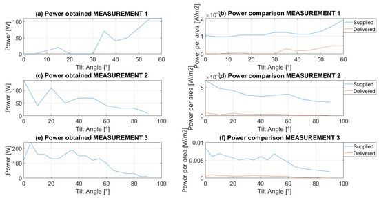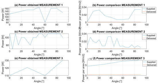 A direct correlation between the power supplied and the power delivered can be observed, which was the expected result. It should be mentioned that, in the geographical location of Poland, the most optimal tilt angle for the operation of PV panels is about 35 degrees. Measurements for periods 2 and 3 show that the regular power yield was the highest in the range from 20 to 60 degrees. Therefore, it can be concluded that this is the most optimal range for the use of PV panels with the sun-tracking control system.