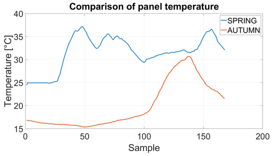 As already mentioned in the paper, PPV panels applied to dynamic building facades are still innovative and experimental solutions. In addition, it should be emphasized that the effectiveness of their operation depends on many external factors and technical parameters of the entire façade installation [55,56]. Therefore, considering the availability of the pilot installation described in Section 2, a case-study approach has been organized to collect and present the results of two short series of measurements carried out with the use of sensors, elements, and devices of this installation.