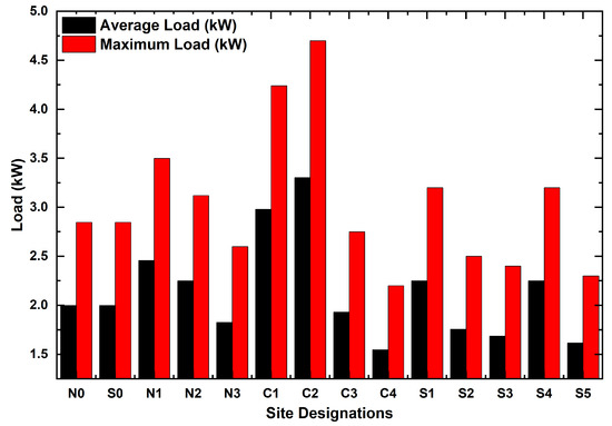 There are 263 BTS (base transceiver stations) sites distributed in the south, north and central regions of Pakistan. In this paper for analysis, a total of 14 sites out of 263 were taken, in which 2 sites were taken as reference, 3 sites were taken from north region (named as N1, N2 and N3), 4 sites are taken from the central (named as C1, C2, C3 and C4), 5 sites were taken from south (named as S1, S2, S3, S4 and S5). The average and maximum loads of all sites are shown in Figure 2, and Table 2.