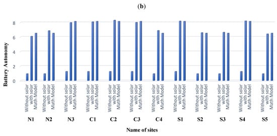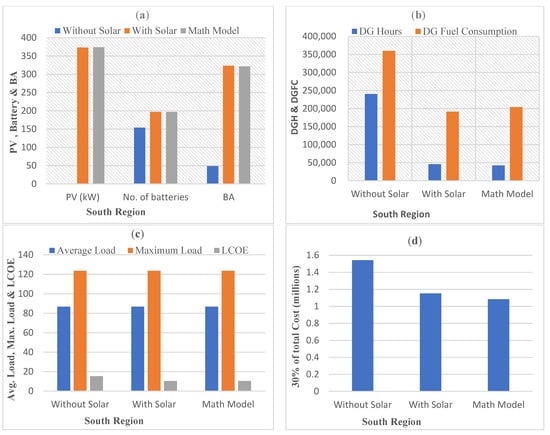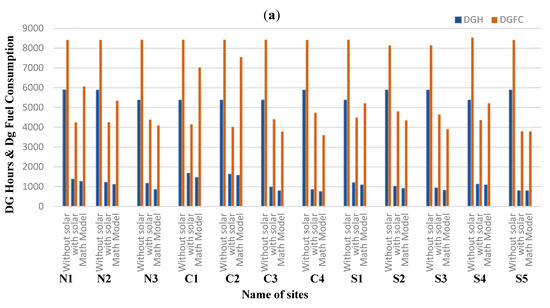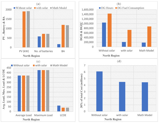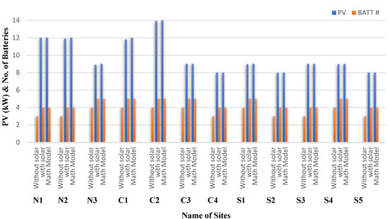 Two reference base sites named Base North and Base South were developed for the integration of solar having maximum loads of 2.8467 kW and average loads of 2 kW, respectively. However, these two reference instances were used as a guide for implementing the other scenarios. Given the understudied areas’ climatic (temperature) characteristics, this research utilized the generic lithium-ion (G-LI-ASM) advanced battery storage model to deliver optimum performance. The temperature effects were used in generic lithium-ion to model the degradation losses. The string size for batteries was fixed at 5 and 4 for Base North and Base South, respectively, because a PV module with a nominal rated voltage of 40 V was linked to a DC bus as an energy source to retain 40 V at the DC bus. As a result, Base North and Base South sites’ fixed prices for one unit of energy was 128 PKR and variable price for one unit of energy was 118 and 113, respectively, which are shown in Table 8.
