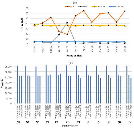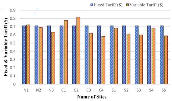 It was observed from the results of the two base site cases that IRR and ROI was not in preferable limits in fix tariff; therefore, the tariff varied from site by site, so that ROI and IRR can be in desired limits. The selective sites with different tariff are shown in Table 9. The tariff varied from minimum 105 PKR (0.583USD) to maximum 147 PKR (0.817USD) and fixed tariff was 128 (0.711USD), because value of 1USD is equal to 180 PKR.
