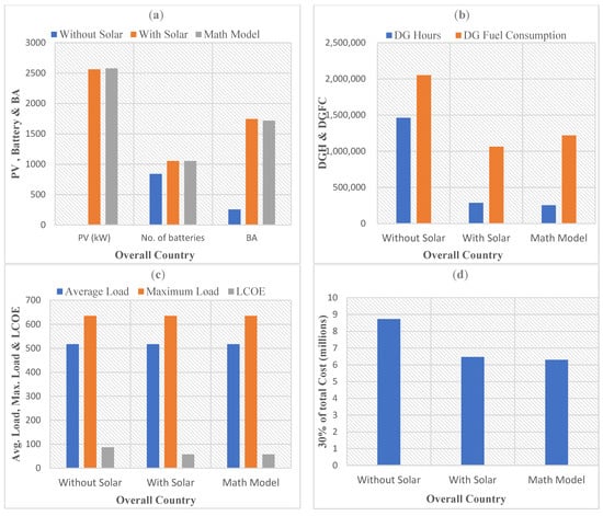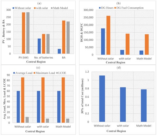 The new aspect of the proposed study is the simultaneous assessment of various decision factors to discover the optimal system. As a result, the LCOE, NPC, ROI, DG hours and carbon emission are used as decision-making factors. Another original aspect of this work is the utilization of real input datasets. The fiscal year 2021–2022, which reflects the country’s actual situation, was utilized to calculate the inflation and discount rates. The suggested study focused on areas with a range of topographical and climatic characteristics. In conclusion, the proposed research is novel because it considers all the fixed errors found in the literature.