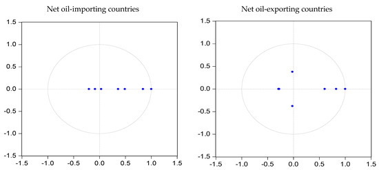 Moreover, the coefficient of determination (R-squared) values indicate that the models are a good fit, explaining about 85.8% of the variation in the net oil importers’ REI and 77.4% of the variation in the net oil-exporting countries’ REI. Additionally, the F-stats are significant, indicating that the overall model is statistically significant. The last two rows show the results of serial correlation LM tests and heteroskedasticity tests. The results indicate that the residuals of the models are non-serially correlated and non-heteroskedastic. This suggests that there are no omitted variables or nonlinearities that might affect the model specification. It is essential that the stability of the VAR model be checked. Figure 1 demonstrates that, for the unit circle, none of the roots are outside which indicates that the P-VECM model is quite stable and that the variables are stationary. Consequently, the estimated model in this study satisfies the model stability test, which means that the interpretation of the estimated IRFs and VRs below is valid [58].