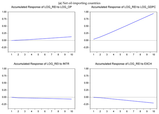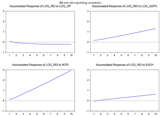 In this study, generalized impulse responses were utilized, in accordance with the innovative studies of Pesaran and Shin [59], to determine the impacts of shocks to independent variables on REI as well as how long these effects last. Figure 2 illustrates the IRFs of REI to the variables for a 10-year period. The results show that unexpected shocks to oil prices lead to a significant rise in REI for net oil exporters throughout the 10-year period but not in oil-importing countries. Moreover, unanticipated shocks to real GDP per capita led to a positive trend in REI for both net oil exporters and oil importers over the 10-year period. On the other hand, unanticipated shocks to interest rates (INTR) led to a negative trend in net oil importers, but the effect is the reverse in net oil exporters over the same period. Similarly, unanticipated shocks to the exchange rate (EXCH) led to a negative trend in net oil importers but a positive trend in net oil exporters over the 10-year period. It is worth noting that these findings are in line with the results obtained via the P-VECM results.