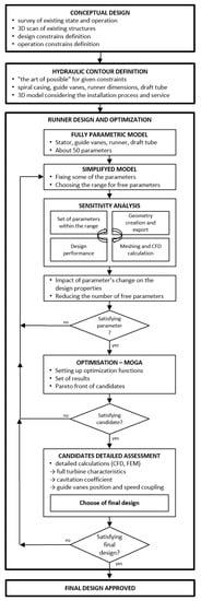 The design workflow assumes that the hydraulic profile of the turbine would be aligned with the spatial and operational requirements. A specially designed runner compensates for the compromised shape of the meridional profile. It is optimized directly for the given hydraulic conditions to achieve high efficiency and the required flow operating range. Figure 1 shows a complete workflow overview.