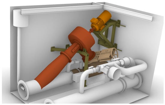 In the second step, the position of the turbine and generator is designed, and the meridional hydraulic contour is defined. The shape of the individual turbine part is adjusted to space constraints and the installation process. The detailed spatial geometry model shown in Figure 2 prevents any conflict during installation or maintenance. The Rhino 3D modeler [13] (commercial software, McNeel Europe, Rhino 7) was used in the presented work.