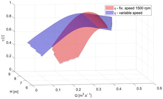 Fixed-speed Francis turbines are designed for a single operating point defined by the head, flow rate range, and runner rotational speed. If the head or flow rate changes out of a limited range, the machine’s efficiency drops and problems with cavitation and pressure pulsations occur [6]. When operated out of the optimum, the residual vortex rotates in the draft tube around the machine axis in the direction of runner rotation (Q < QBEP) or against it (Q > QBEP). That leads to a reduction in turbine efficiency and other unfavorable phenomena. Adjusting the runner rotation speed eliminates vortex creation [7].