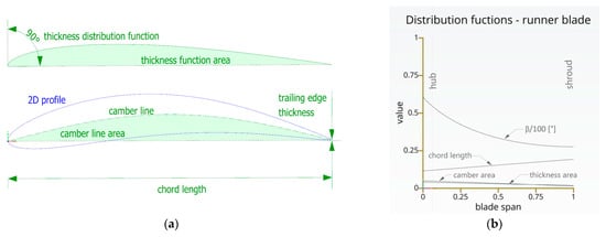 The distribution functions shown in Figure 4b express these values as a function of the relative blade span. Ten parameters define the distribution functions. Its shape, and therefore the shape of the blade, is subject to optimization. The presented parametrization benefit is a low number of parameters, but it provides only limited options for varying the shape of profiles. More complex blade parametrization was presented by Kantor [22] using individual profile points or Kyriacou [23] using Bezier curves.