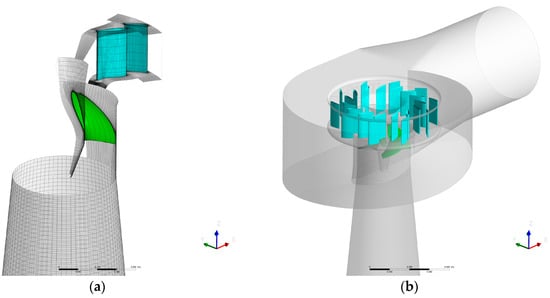 Model for numerical simulation. (a) The sectional model used for optimization. (b) Model of the full turbine with spiral casing used for the turbine characteristics calculation.