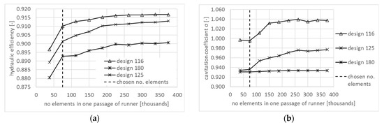 The structured computational mesh was created in Ansys Turbogrid for blade passages and ICEM CFD for the draft tube and spiral casing (later used for detailed computations). Figure 6 shows the results of the mesh sensitivity analysis. It shows a loss of accuracy, but the design comparison is adequate.