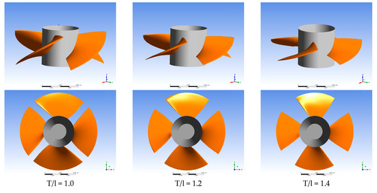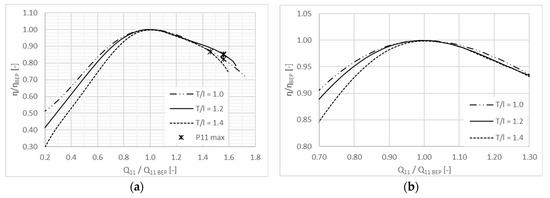 Three turbine designs with various T/l ratios, shown in Figure 7, were assessed by CFD to verify the influence of the T/l ratio t. All designs have a Q11 BEP = 1.6 m3/s (±5%), which corresponds to the designed SHPP Podhora turbine and hydraulic efficiency in the BEP higher than 90% (based on the simplified CFD model as described in Section 2.4.2). Details are provided in Table 2. The complete characteristics of the turbines were calculated from about 200 combinations of runner rotational speed and guide-vanes position. The variable-speed efficiency ridge was extracted from the characteristic.