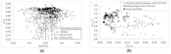 The extensive sensitivity analysis allowed us to reduce the number of optimization parameters. Figure 9a shows the hydraulic efficiency of the designs generated during the sensitivity analysis and optimization. Only designs within the acceptable flow range were considered.