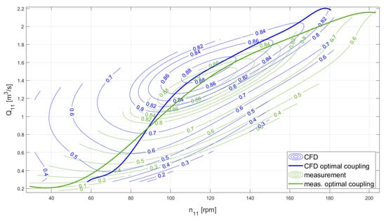 The resulting turbine characteristics are constructed from approximately 100 operating points (a combination of the guide vane’s position and operation speed) using an in-house previously developed script [34,35] prepared in MatLab®. In the first step, the data are recalculated to unit parameters and processed into universal characteristics, as shown in Figure 11. Other scripts follow this processing to construct operating characteristics for both the variable-speed and fixed-speed variants, as shown in Figure 3.