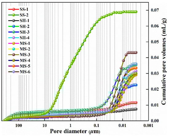 According to the data of the MIP tests, the PSD curves shown in Figure 2 demonstrate the distribution of pore structure. The pore types of experimental samples are dominated by nanopores (r < 1 μm) and micropores (1 μm < r < 62.5 μm). Meanwhile, the pore volumes of the investigated samples are within the scope of 0.0074 mL/g (SH-1) to 0.069 mL/g (SS-2). The PSD curves contain three types. The PSD of most clay rock samples has a similar trend that the total pore volume increases rapidly within the scope of 0.01 μm to 0.1 μm while increasing weak in the rest of the pore size range, which indicates the pore types of rock samples are dominated by nanopores ranging from 0.01 μm to 0.1 μm. Meanwhile, the cumulative pore volume of sandstone samples (SS-2) is significantly larger than that of the others, indicating that SS-2 has the greatest porosity. In addition, the PSD curve of SS-2 increases rapidly in the range of 0.01–10 μm, while it is relatively smooth in other pore sizes, indicating the dominant pore size of SS-2 ranges from 0.01 μm to 10 μm. Moreover, the PSD curves of samples (SS-1 and SH-1) maintain a weak variation range in the full pore size range, only increasing slightly when the pore size is less than 0.1 μm, which indicates that the dominant pore type of SS-1 and SH-1 is a nanopore.